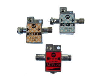 Tłumiki stałe przeznaczone są do korekty poziomu sygnału o zadaną wartość w paśmie kanału zwrotnego 5 – 65 MHz, zaś w pozostałym zakresie wnoszą minimalne tłumienie.